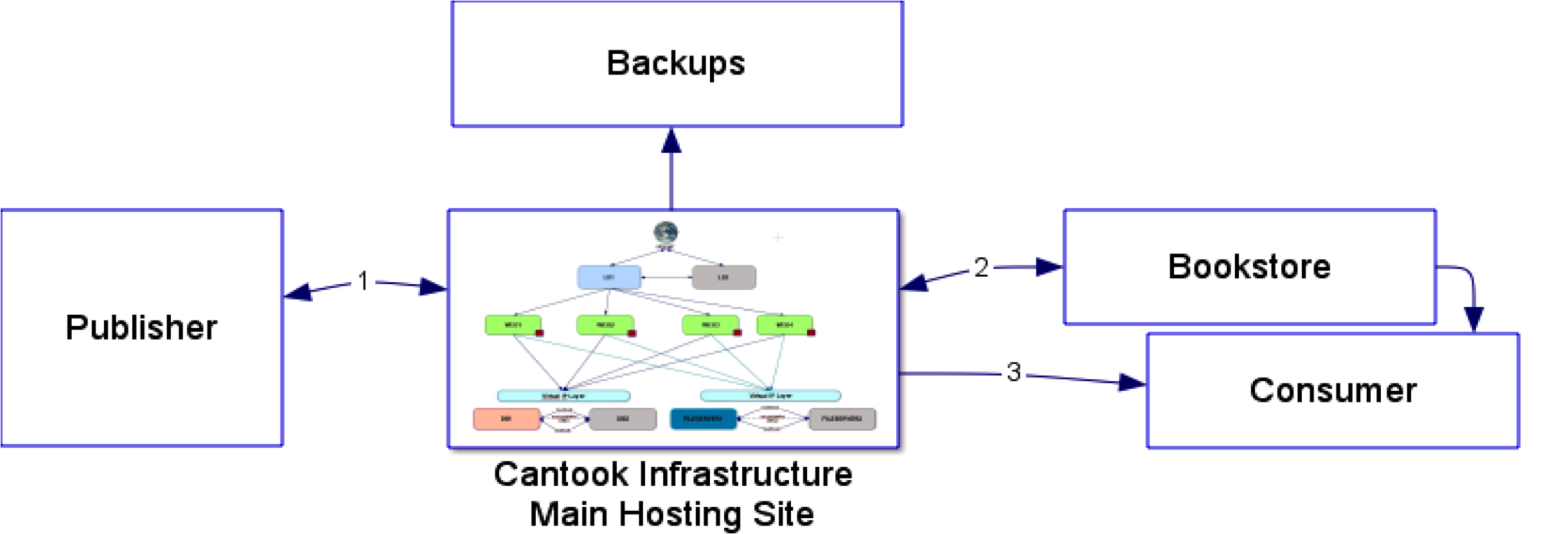 Per assicurare il più alto livello di accesso e integrità dei dati e di disponibilità del sito, l’infrastruttura hardware per il sito principale di Cantook è ridondante. Il diagramma seguente mostra tutto l’hardware utilizzato: