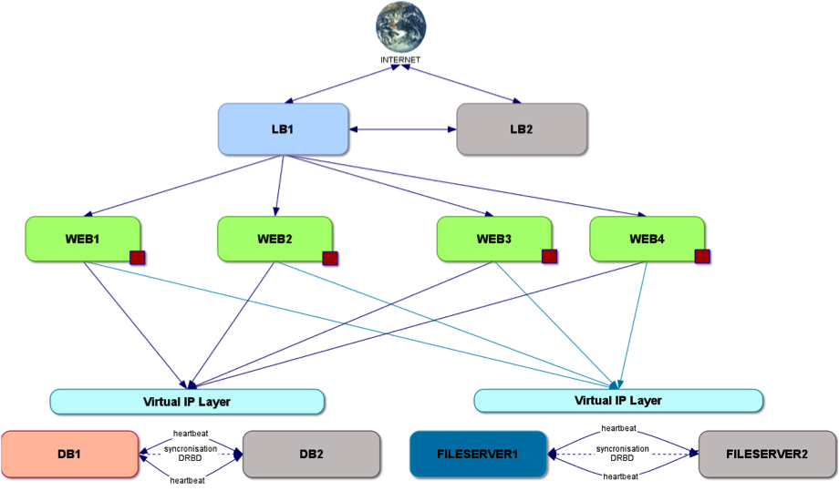 - Loadbalancers, database server e file servers sono in modalità master/slave e mantenuti in sincronizzazione "realtime". Il clone viene cioè attivato quando il server primario cessa di funzionare